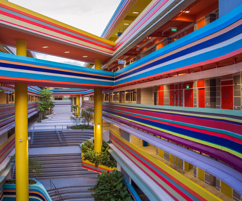 В продолжении цикла “Школы мира” ещё один уникальный экземпляр реализации дизайна учебного заведения. На этот раз с восточной стороны, а точнее из Сингапура. Называется проект “радужная школа”. Уникальность его состоит в том, что это не созданный с нуля проект. Это обычная школа без новаторских программ обучения. Просто два архитектурных бюро решили придать зданию уникальный вид и выбрали очень простое, но невероятно эффектное решение - разукрасили весь фасад здания горизонтальными цветными линиями! Школа превратилась в точку притяжения для детей и даже взрослых. Согласитесь, такой внешний облик здания делает его максимально привлекательным для детей. Туда хочется попасть, погулять по балконам, заглянуть во внутренний двор, обойти школу кругом. Благодаря такому цветовому решению всё внутреннее пространство школьного двора поменялось - стало просторнее, светлее, ярче. Здесь радостно даже в дождь и пасмурную погоду, потому что свет преломляется и отражается во всем вокруг! Сюда абсолютн
