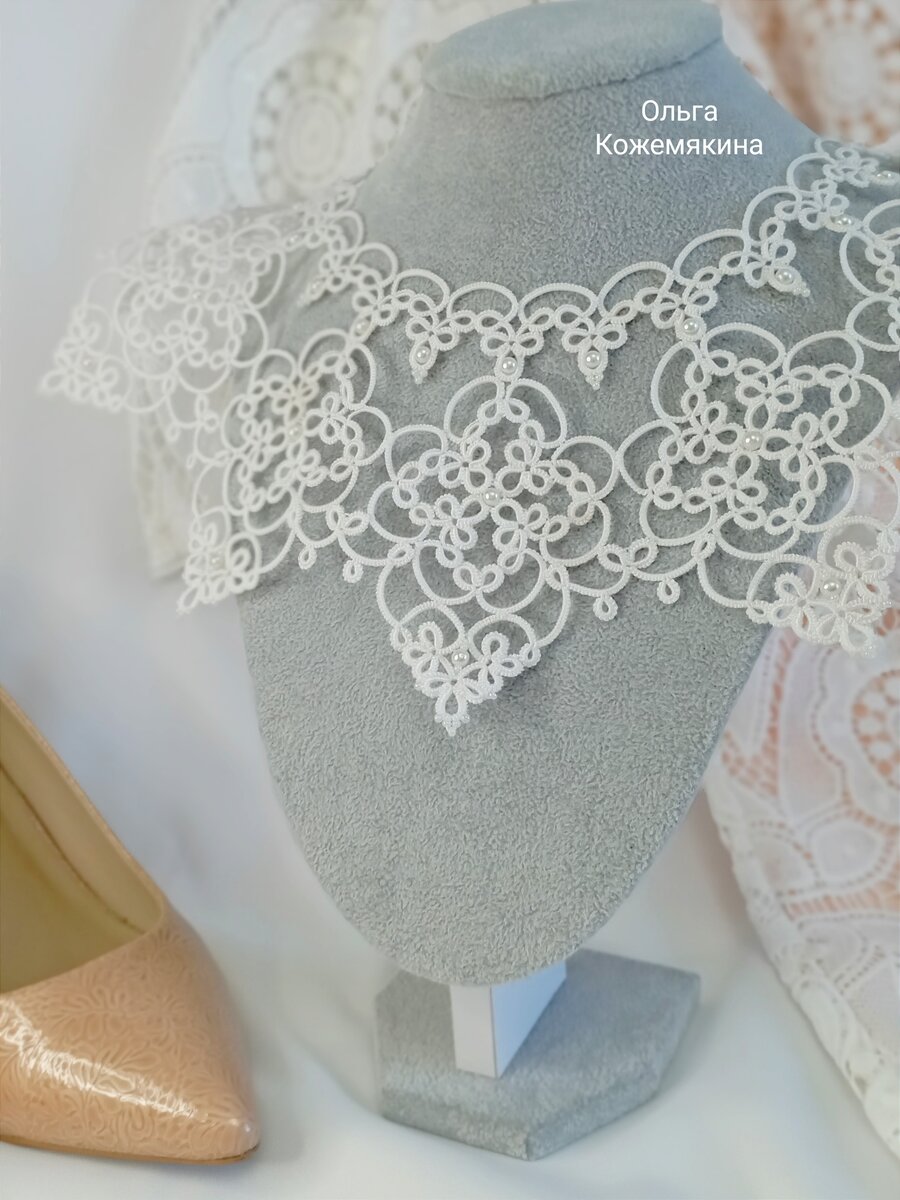 Всем здравствуйте! Помните, летом я плела большой белый воротник по схеме польского мастера Яна Ставаша? Вот последний мой пост по процессу плетения. Я уже давно его закончила, но всё никак не получалось написать статью. То фото не красивое, то времени нет, то болезни разные, то другие проекты ... Но, всё таки, нужно уделить время этому проекту и рассказать вам о результате моей работы, ведь воротник получился потрясающе красивым и нежным! Работа очень большая, не лёгкая (причём не только из-за схемы, но и из-за цвета). Очень сложно плести белыми нитками и не запачкать их (даже если моешь руки с мылом, прежде чем взять изделие), а потом ещё и отстирать. Плела я двумя нитками - капроном и полиэстером Safira, так как в конце второго ряда стало понятно, что капрона не хватит для завершения работы. Расшивка выполнена чешским бисером Preciosa перламутрового цвета и белым искусственным жемчугом из стекла. Воротничок получился большой - наружный диаметр 36 см (почти полностью прикрывае