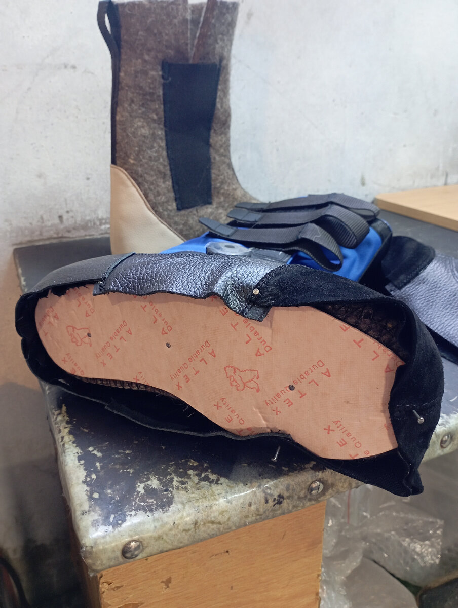 Заготовка у нас сшита, внутренние сапожки́ из войлока тоже. Настало время собрать всё воедино. Затяжка обуви, от слова тянуть. Необходимо натянуть заготовку обуви на колодку (в нашем случае колодка внутри войлочного сапожка́). Кожа ботинка должна быть натянута с усилием и равномерно. Гвозди в затяжную кромку вбиваются так, чтобы после укладки кожи на стельку, не осталось глубоких складок на боковой проекции колодки. Затяжная кромка и стелька промазываются клеем, после чего гвозди загибаются и а таком виде всё остаётся сохнуть около 12 часов. Затем гвозди необходимо удалить, затяжную кромку выровнять ножом от складок и взъерошить наждачной бумагой. Теперь на подготовленную поверхность следа нужно приклеить композитную межподошву. А поверх межподошвы клеим основную подошву из термоэластопласта. Ну и собственно готовый результат. Очередные ботинки Росомаха 820В скоро уедут к покупателю. Надеюсь было интересно. Если возникнут вопросы, с удовольствием отвечу в комментариях. Благодарю за в