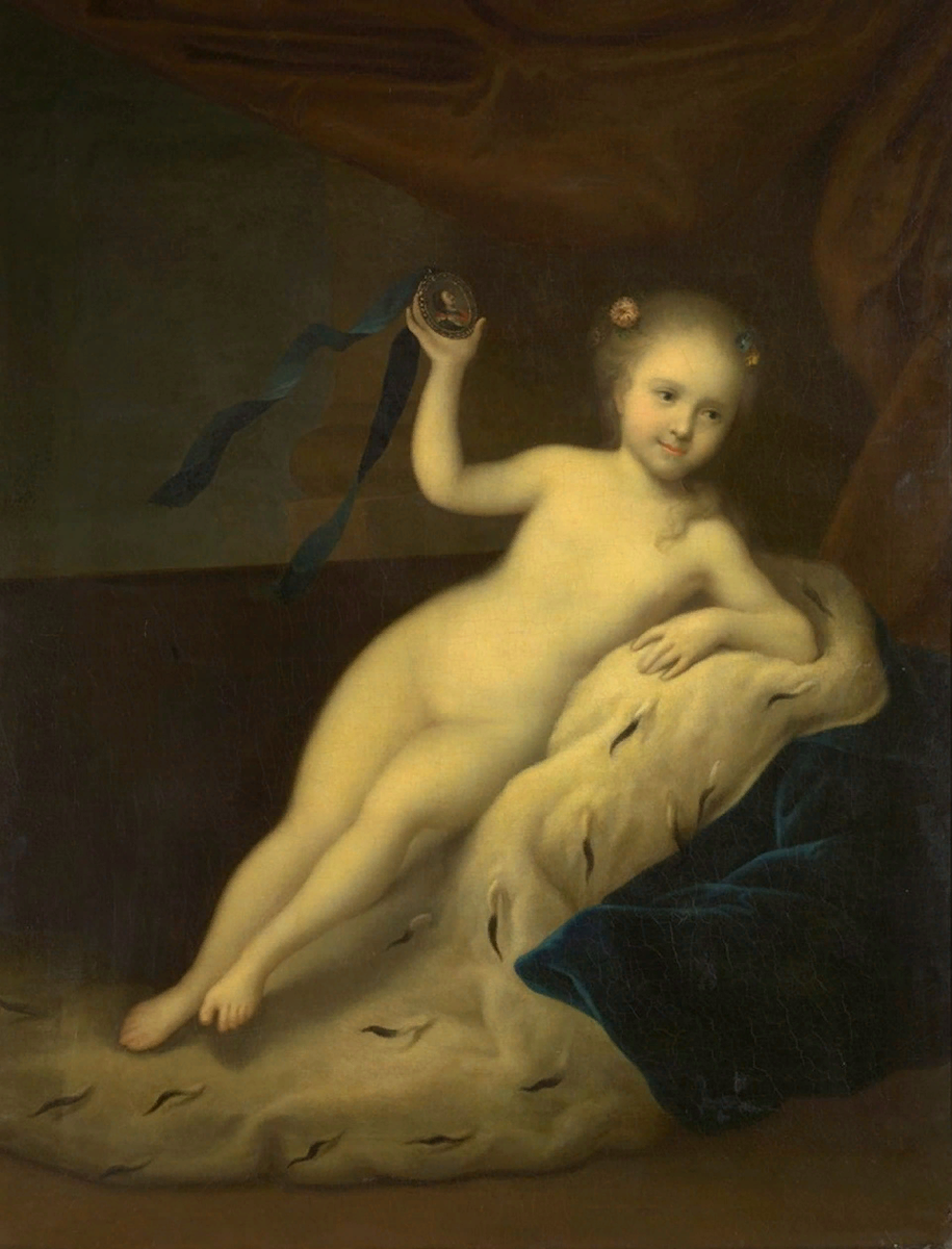 Портрет ребёнка - многие ли в восемнадцатом веке могли себе такое позволить? Дорого... Зато - "статусно"! Увековечить маленького наследника с атрибутами власти, да ещё и в каком-нибудь мифологическом образе, с отсылкой к античности - тут сам государь Пётр Алексеевич пример подаёт! Родную дочь заказал изобразить этакой маленькой богиней Флорой: Два года Лизаньке, мантию на неё ещё не наденешь - так отчего бы ей не прилечь на царственные горностаи? А что фигура не "двухлетняя" - ну так же "божественее"! И тут же её братец Петенька "в виде Купидона". Корону на него ещё не наденешь - так пусть просто полежит рядом! Оба портрета написал Луи Каравак: русских художников ещё предстояло обучить. И одним из первых стал Иван Вишняков. Его "Портрет Голицына" ещё в традиции прошлого, семнадцатого века: без фона, с условно-плоской фигурой. Зато какой "подробный" мундир конногвардейца! И как живо лицо будущего воина, а пока девятилетнего мальчугана... Автор этого портрета неизвестен. Маленький скрипа