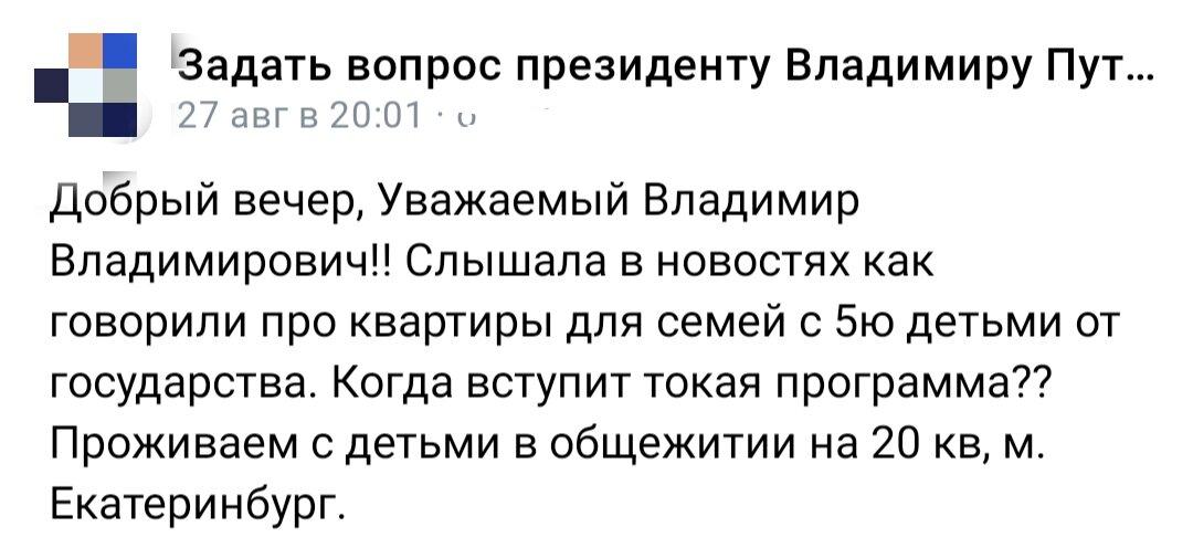 Как то в одной из социальных сетей наткнулась на группу где люди со всей России задают вопросы нашему Президенту РФ В.В. Путину. Естественно в данной группе нет президента, и даже его помощников как многие думают из тех людей кто туда пишет и надеется на скорый ответ и мгновенное решение их проблемы! Так вот представлю вам мизерную часть задаваемых вопросов. Тут в ответ хочется задать вопрос автору данного обращения, зачем рожать 5-х детей если вы живëте в малюсенькой комнатке?. Доплату к МатКапиталу который БЫЛ ПОТРАЧЕН.... Разобраться нужно в чëм? Почему у них превышает доход на прохождение пособий? Наверное потому что они зарабатывают больше ПМ.... А что вы на это скажите? 👆👆👆 Многодетные считают что им можно вообще не работать?! Круто 😎 Ну вот как то то так.... Тут без комментариев. И опять многодетным все должны и обязаны. И в заключении вот такое обращение! Как вы считаете - Всем или Никому? Продолжение следует...