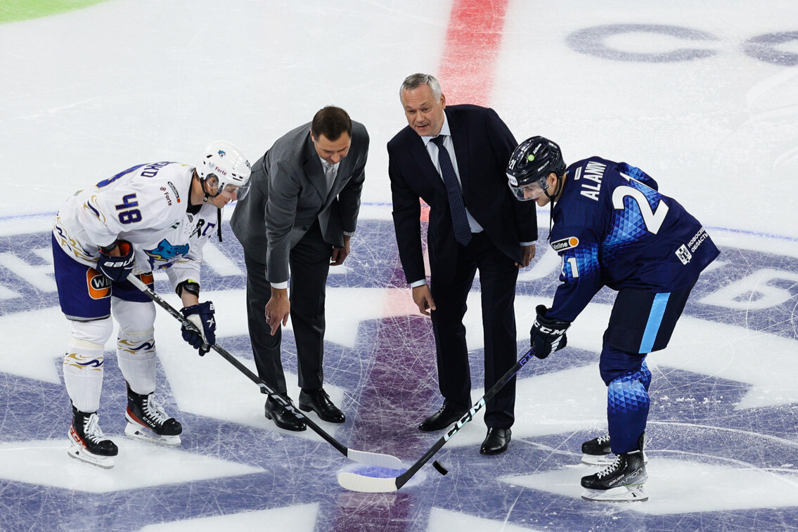 Открывало сезон Континентальной хоккейной лиги эффектное лазерное и световое шоу. В центральном круге появились недавно завершивший спортивную карьеру Егор Миловзоров и титулованный Дмитрий Затонский ― оба являются воспитанниками новосибирского хоккея. В рамках небольшой сценки мастера игры с шайбой показали некоторые из своих умений на ограниченном участке поля.