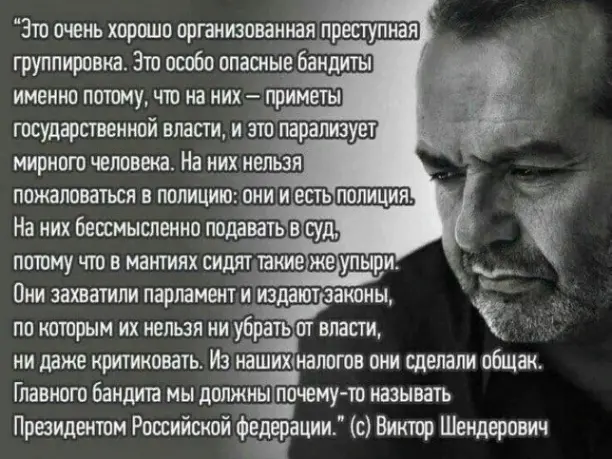 Осатаневшие и больные, с ущербным самолюбием, мелкодушные и обезумевшие, патологически жадные, бесноватые выродки паразитирующего режима, связанные с международной преступностью, практически повсеместны в управлении нашим государством, они и крышуют весь криминал, который сами же и организовывают:
