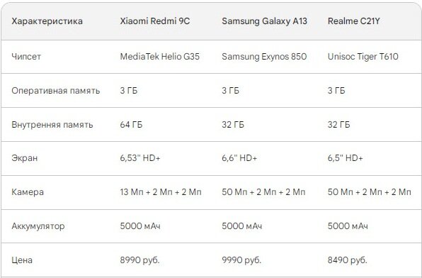 Для сравнения взяли 3 наиболее популярных смартфона в этом ценовом диапазоне: Xiaomi Redmi 9C, Samsung Galaxy A13, Realme C21Y. Как видим, все три смартфона имеют примерно одинаковые характеристики, но есть некоторые отличия. Xiaomi Redmi 9C имеет более мощный чипсет, чем Samsung Galaxy A13 и Realme C21Y. В свою очередь, Samsung Galaxy A13 имеет более высокое разрешение экрана и более мощную основную камеру. А Realme C21Y имеет самую низкую цену продажи. Исходя из этого можно сделать вывод, что смартфоны подойдут разным людям и каждый из них имеет свою целевую аудиторию. Xiaomi Redmi 9C подойдет людям, которые хотят получить максимально мощный смартфон в этом ценовом диапазоне. Он отлично подойдет для игр, просмотра видео и других ресурсоемких задач. Также он подойдет для тех, кто хочет получить большой экран для просмотра фильмов и сериалов. Samsung Galaxy A13 подойдет людям, которые хотят получить смартфон с хорошим качеством изображения. Его 50-мегапиксельная основная камера позвол