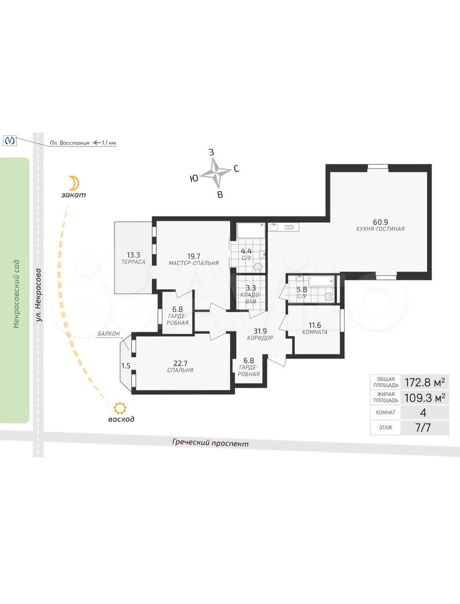 Жилой комплекс Бассейного товарищества не раз встречался на страницах этого блога, мы подробно рассмотрели это место примерно год назад. Спустя некоторое время мне повезло побывать в одной из коммунальных квартир, о чем тоже был написан небольшой рассказ. И вот, спустя год, рынок недвижимости выдал очень уникальную квартиру в этом доме. Квартира - великолепна) Расположена в мансардном этаже, который при строительстве предназначался для проведения совместных мероприятий, устраиваемых для жильцов этого дома. По плану это четырёхкомнатная квартира на седьмом этаже, площадью 172.8 метров квадратных. Как видно из плана, квартира двухсторонняя, и разделена на две части, одна из которых выходит во внутренний двор , а вторая часть окнами выходит на на улицу Некрасова. Выделяется квартира двумя яркими деталями - огромной кухней-гостиной и большой террасой. Кухня-гостиная - огромна, и была частью зала для общих собраний, благодаря этому здесь потолки в фантастических 4.5 метра высоту. Хотя ко
