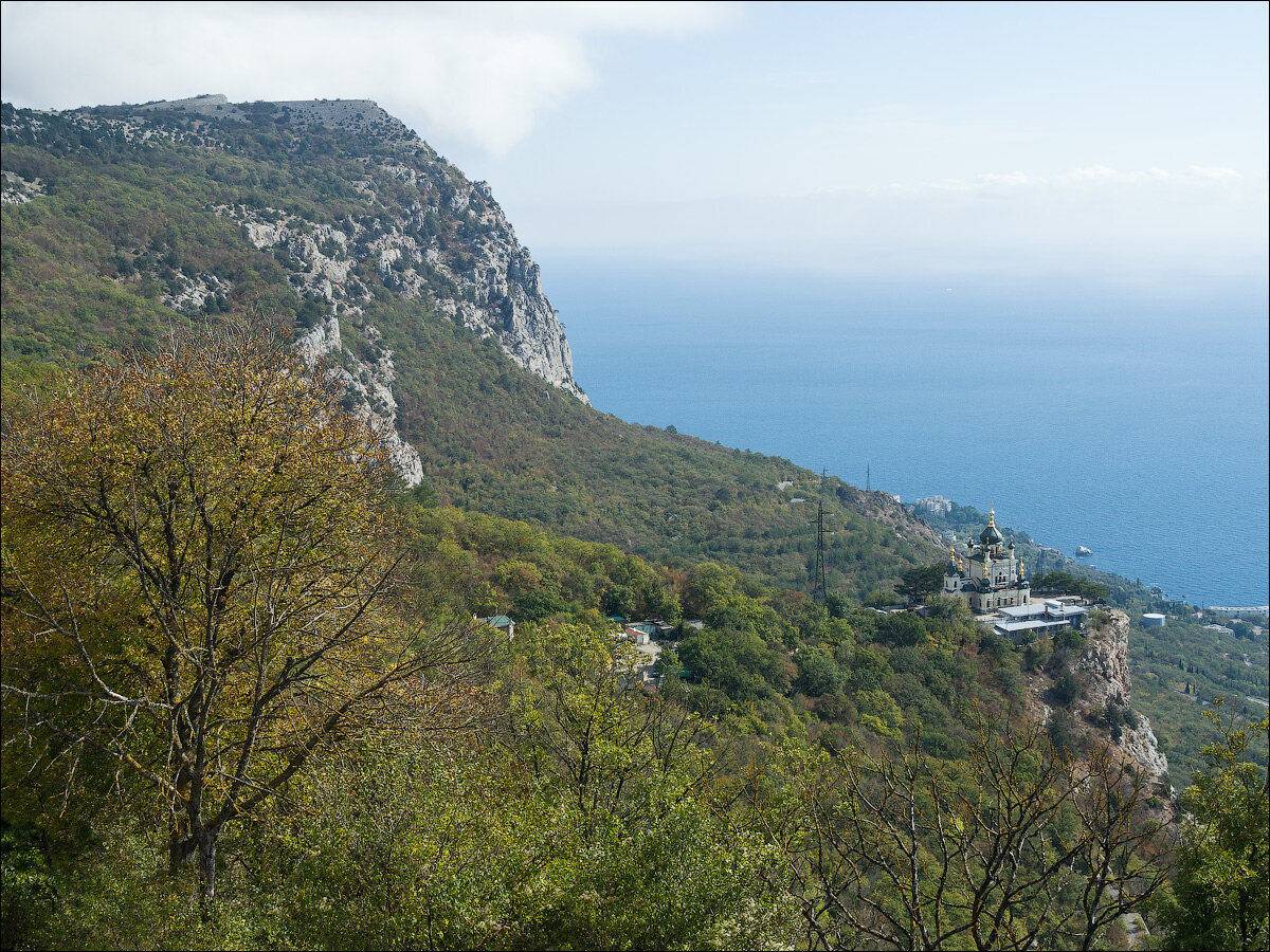 С удовольствием отобедав, мы поднялись на смотровую у Байдарских ворот над Воскресенскою церковью. Полюбовались вольным сине-зелёным простором, в котором, словно диковинная статуэточка, сиял на скале крохотный точёный силуэт с куполами.