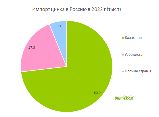 По данным обзора "Экспорт и импорт цинка в России", подготовленного BusinesStat в 2023 г, в 2022 г Россия являлась чистым импортером цинка, то есть в страну больше ввозили продукции, чем вывозили с ее территории. По оценкам BusinesStat, в 2022 г импорт цинка в Россию составил 83,3 тыс т. В 2022 г наибольший объем импорта цинка на территорию России приходился на январь – 9,6 тыс т. В июне объем импортных поставок цинка в страну был наименьшим за год – 4,7 тыс т. В 2022 г основной страной-поставщиком цинка на территорию России являлся Казахстан – 73,1% от совокупного импорта или 60,9 тыс т. На втором месте по импорту цинка на российский рынок в 2022 г находился Узбекистан – 20,7% от совокупного импорта или 17,3 тыс т. По стоимостному импорту цинка в Россию в рассматриваемый период также лидировал Казахстан – 73,4% совокупного оборота импорта. Поставки из Узбекистана составили 19,7% общей стоимости. Полный обзор рынка на РБК: https://marketing.rbc.ru/research/49364/ Полный о
