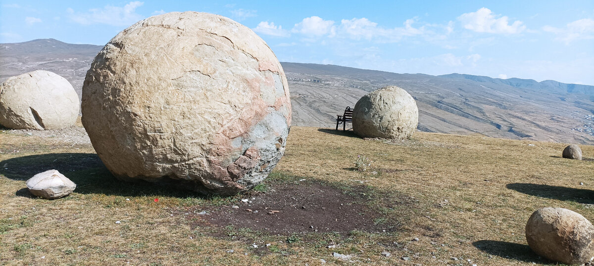 В Ботлихском районе, не далеко от селения Анди ,высоко в горах расположены на ровном плато шаровидные камни разных размеров. Гигантские каменные шары встречаются и в других уголках земного шара – например, в Арктике,республике Коми , в Боснии. И хотя в их внеземное происхождение верят лишь любители мистики, а геологи дают их появлению вполне земное объяснение, версия о «великане, разбросавшем по планете каменные мячи» выглядит весьма красиво, таинственно и продолжает волновать туристов. Фантастическая картина напоминает кладку яиц динозавров или остатки древней цивилизации. Еще, по словам местных жителей, во время летней жары на теплых камнях нужно сидеть или лежать, чтобы снять боли в пояснице. Якобы камни даже способны «заряжать» людей земной энергией. Образование конкреций происходит примерно так: на стенках возникают наросты, разрастаясь навстречу друг другу, они смыкаются и образуют различные формы. Преобладают конкреции шаровидные, дискообразные, реже встречаются в форме эллипс