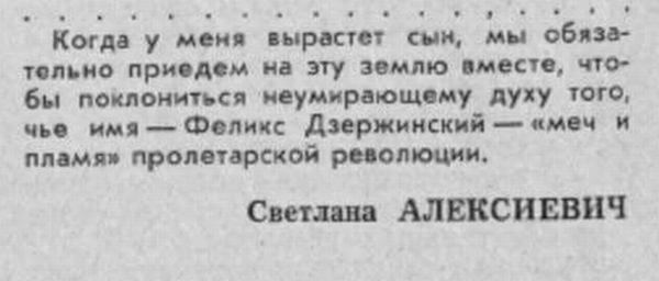 Цитата Нобелианта в тему: В этом году г-жа Алексиевич встретила канун этого светлого дня в окружении послов стран Евросоюза. "В четверг сотрудники европейских посольств в Минске вновь приехали домой к нобелевскому лауреату по литературе Светлане Алексиевич, которая накануне сообщила, что в её квартиру пытаются проникнуть неизвестные люди — предположительно, силовики... Алексиевич навестили дипломаты из Австрии, Франции, Германии, Италии, Литвы и других стран — всего более полутора десятков диппредставителей" (из новостей). И как же Светлана Александровна права! Меч и Пламя нашей революции, Феликс Эдмундович — вот кого нам ныне не хватает, вот кто нам остро нужен! Уж он бы моментально разрулил эту запутанную ситуацию, всем воздал бы по заслугам, и никто не ушёл бы обиженным». :)