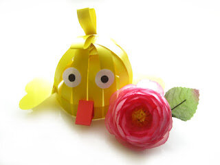 Яркий и объемный цыпленок из цветной бумаги порадует своим весенним теплом и солнечными лучами. Такой вариант бумажного изделия подойдет как для обычной поделки, так и для объемной карнавальной маски на голову ребенка. Необходимые материалы: Туловище цыпленка будет состоять из полосок. Для основания вырезаем длинную полоску из желтой бумаги, где ширина 1,5-2 см. Теперь еще вырежем несколько штук полосок с шириной 1 см. Именно при помощи них создадим нужный объем цыпленку. Склеиваем основу из полоски в виде колечка. Если первая полоска была вертикальной, то вторую приклеим горизонтально. Затем под углом приклеиваем еще две полоски, чтобы закрыть пространство между горизонтальной и вертикальной линией. Между каждой полоской приклеиваем еще одну, чтобы плотно закрыть туловище цыпленка. Теперь из желтой бумаги вырезаем крылышки. Сгибаем 0,5 см с каждого края заготовки для нанесения клея. Приклеиваем по бокам крылья цыпленка. Из желтой бумаги вырезаем длинную полоску. Сгибаем несколько р