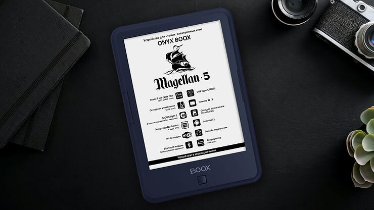 Буквально недавно ONYX BOOX представила новинку - модель ONYX BOOX Magellan 5. Ридер имеет 6-дюймовый экран высокого разрешения с двухцветной подсветкой и сенсорным управлением. Аппаратная платформа модели базируется на высокопроизводительном процессоре Qualcomm, имеет 2 ГБ оперативной и 32 ГБ твердотельной памяти. Встроенные модули Wi-Fi и Bluetooth существенно расширяют коммуникационные возможности ридера, а операционная система Android 11 позволяет устанавливать и использовать сторонние приложения. Модель выполнена в классическом корпусе с кнопками листания и отличается от предшественников оригинальным темно-синим цветом. 6-дюймовый экран E Ink Carta Plus, установленный на ONYX BOOX Magellan 5, обладает самыми высокими разрешением и контрастностью для дисплеев данного размера. Модель имеет емкостное сенсорное управление, обеспечивающее дополнительное удобство при чтении и использовании других функций ридера. Встроенная подсветка MOON Light 2 позволяет плавно регулировать оттенок цве