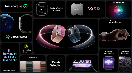 Первой новинкой, представленной на мероприятии, были новые часы от Apple: К 20-й минуте презентации было показано три продолжительных видео. Интересно, что все Apple Watch теперь работают только на 100% солнечной энергии, а при производстве ремешков не используется натуральная кожа - только экологически чистые материалы. Цены на Apple Watch девятой модели в США начинаются от $399.