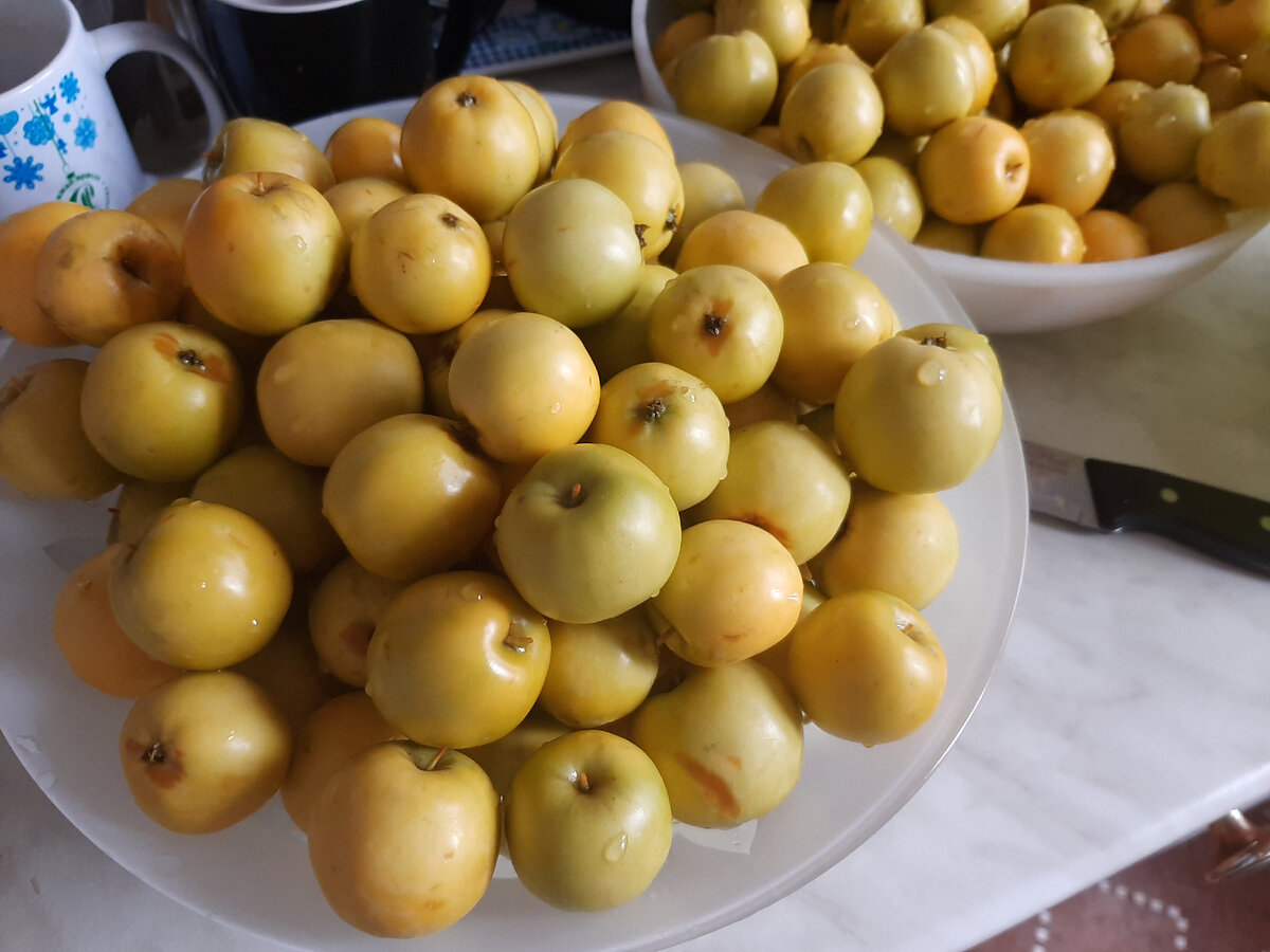 Сок это отличный способ быстро переработать большой урожай ранеток. Ничего лишнего, минимум возни, главное наличие соковыжималки. Подойдет для детского и диетического питания. Здравствуйте уважаемые дачники и им сочувствующие. Только владельцы яблонь-полукультурок меня поймут. Даже в неудачный год урожай ранеток это несколько ведер. А в удачные это их десятки. Что с этим богатством делать, если они еще и не особо лёжкие, а варенье я не люблю? Про то как делать пюре я уже писала. Сок делать еще проще - главное наличие соковыжималки. Ранетки могут быть и не особо зрелые, главное не дать им залежаться и превратиться в "картошку". 1. Ранетки мою и параллельно обрываю палочки. Немного подчищаю тыл яблока (остатки чашелистиков), но полностью не вырезаю. 2. Разрезаю ранетки пополам. Так лучше влезает в мою соковыжималку. Можно заморочиться и вырезать сердцевину, особенно если вы собираетесь что-то сделать из жмыха. Но, это же ранетки, так отходов получается еще больше, а мусор через сок