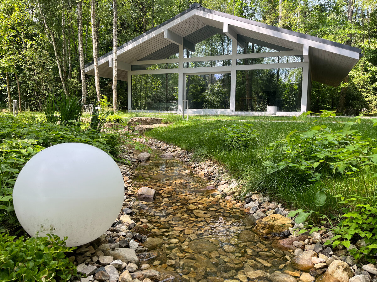 Очаровательный одноэтажный дом "Эдинген" площадью 100 квадратных метров утопает в дикой природе. Расположенный на земельном участке среди густых лесов в закрытом элитном поселке, он выполняет роль гостевого дома с собственной парной, относящейся к резиденции и нескольких построек. Его особенной чертой является просторная терраса, омываемая теплыми лучами солнца, которая расположена непосредственно у грани леса. Мы специально организовали на участке искусственный пруд и систему ручейков, как описано в нашей предыдущей статье о создании водных элементов на участке. Ландшафт максимально приближен к дикой природе, с ненавязчивыми тропинками и деликатным освещением, воплощая в жизнь идею гармонии с окружающей средой. Сам дом спроектирован с учетом максимального комфорта гостей. Внутри вы найдете две уютные спальни, одна из которых оборудована секретной антресолью для особого комфорта (мы тоже про нее писали), а также просторную гостиную, объединенную с кухней. И, конечно, высококлассная