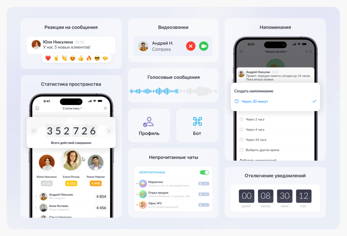 В нем есть все функции привычного мессенджера и дополнительно — набор мощных инструментов, повышающих продуктивность команды.