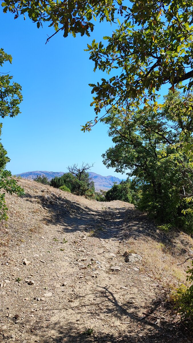 Возвращаться мы решили коротким маршрутом, через Судак и такси. Спуск в ту сторону более цивилизованный, периодически встречаются указатели и лавочки. Но мы не ищем легких путей, поэтому в какой-то момент поворачиваем не туда и оказываемся в русле ручья. Тропинка еле видна и мы начинаем переживать, а туда ли мы идем. И тут нас бодро обгоняет мужик с пятилитровкой родниковой воды и быстро скрывается за ближайшим можжевельником.
