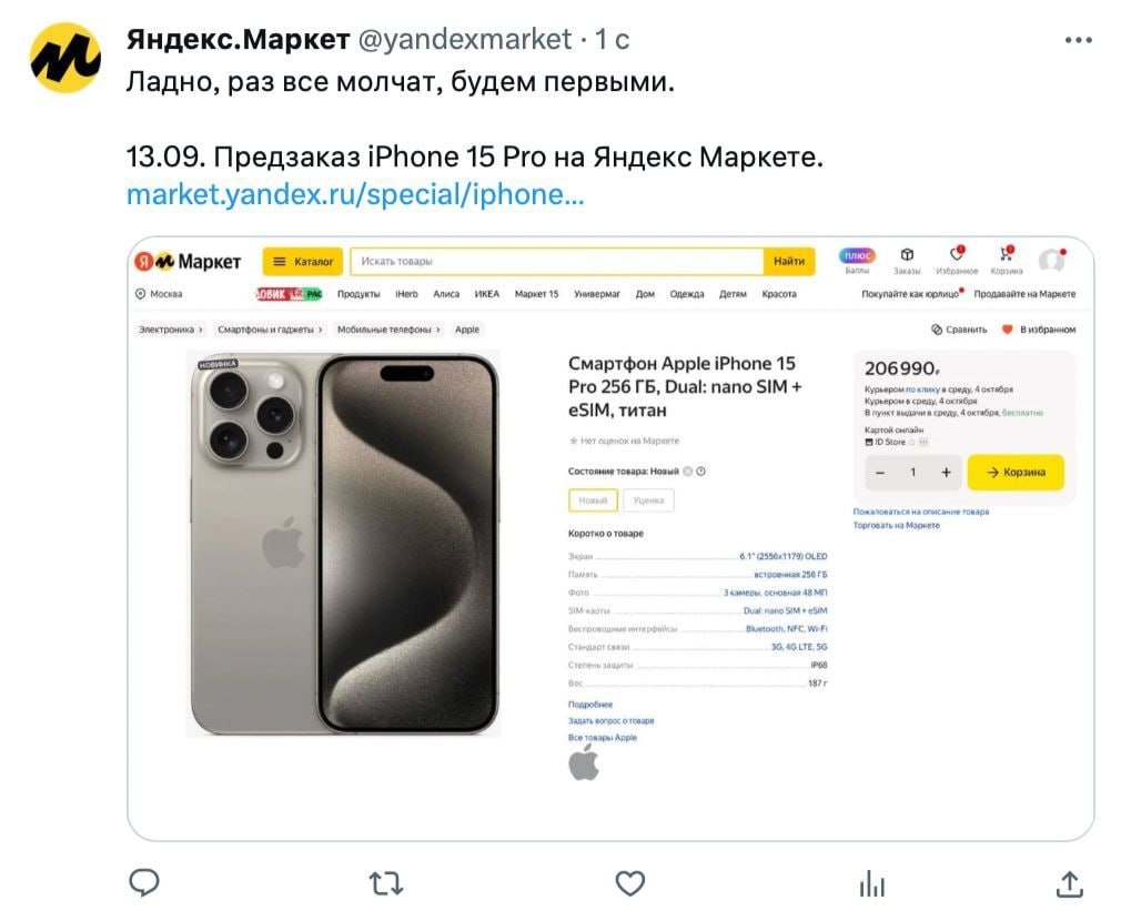 Не успели Apple представить iPhone 15 Pro, как его стоимость уже анонсировали на Яндекс Маркете. Платформа первой в России показала официальные цены на новинку.