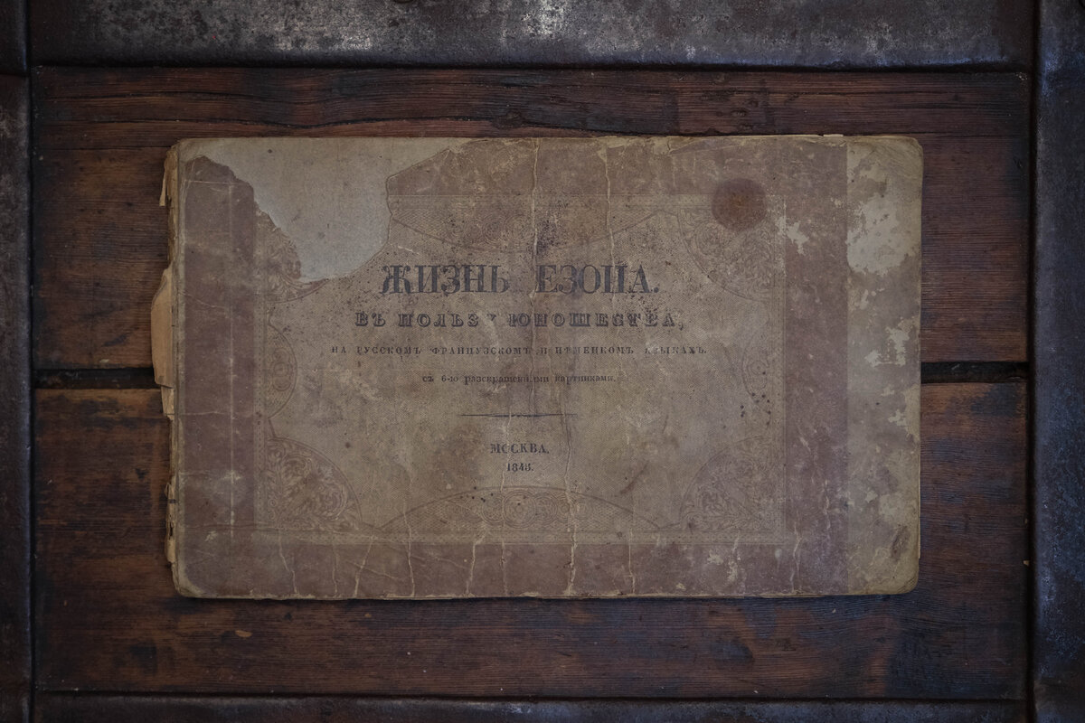 На эту тему нас натолкнула очень занимательная книга, пришедшая в работу – “Жизнь Езопа в пользу юношества в русском французском и немецком языках”, изданная в Москве в 1845 году. Книга пришла в весьма ветхом состоянии: многочисленные масштабные утраты и потертости переплета, практически отсутствующий корешок. Блок очень слабый, на страницах – загрязнения, затеки и заломы, выпадающие листы. Мы промыли и укрепили блок, отреставрировали загибы и перешли к работе с переплетом. Его мы также почистили, дорастили каждую потертость, восполнили каждую утрату, таким образом максимально продлив жизнь книге. Книга снабжена шестью красочными иллюстрациями, которые переносят читателя в Древнюю Грецию, где и жил главный герой произведения – легендарный античный поэт-баснописец Эзоп. Легендарен Эзоп не только благодаря своим произведениям, но и своей биографии: она базируется на слухах, мифах и легендах, так как никаких прямых свидетельств до нас не дошло. Впервые об Эзопе говорит Геродот: по его сло