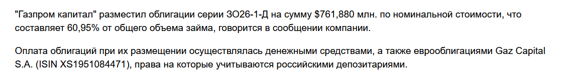 После январских выпусков 2023 года: Газпром в начале февраля выпустил следующую долларовую замещающую облигацию: ГазКЗ-26Д, ГАЗПРОМ КАПИТАЛ-ЗО26-1-Д, ISIN код: RU000A105RG4, вместо еврооблигации XS1951084471. которая стала самой короткой среди долларовых облигаций Газпрома. Процент замещения выше стандартного для Газпрома - 71.37 %. Купон полугодовой - 5.15%. На Московской Бирже облигация появилась 2 февраля 2023 года, но ликвидные торги начались 06 февраля 2023. За прошедшее время средневзвешенные за день цены в процентах от номинала были: С учетом НКД: График рублевых средневзвешенных за день цен: за прошедшее время средневзвешенные за день с учетом НКД цены в рублях были: С момента начала ликвидных торгов (06.02.2023) доходности составили: Обратите внимание, что это пока единственная облигация, выпущенная в 2023 году и принесшая инвесторам положительную доходность в валюте. Также облигация самая ликвидная из рассмотренных. Таблица с итоговыми данными по уже рассмотренным облигация