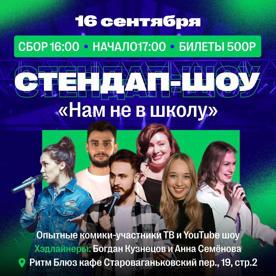 Суббота. Вечер. Стендап. Именно таким может стать ваш вечер 16 сентября! 16 сентября в Rhythm & Blues Cafe состоится заряжающий вечер комиков, которые уже прошли не только общеобразовательную школу, но и школу жизни, о чем, собственно, они в комичной форме вам расскажут. На сцене выступят комики, знающие о юморе все и даже больше, о чем свидетельствуют их выступления на различных шоу YouTube и ТВ. Хедлайнером мероприятия станет участница шоу "Женский стендап" на ТНТ Анна Семёнова. Мероприятие состоится по адресу: Староваганьковский пер., 19, с.2. Подробная информация и билеты доступны по ссылке. До встречи!