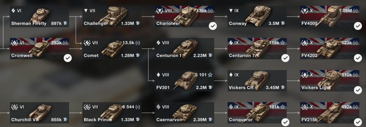 И всего топов у Британии семь штук, четыре прокачки и три премиум танка. Опять я кратенько расскажу про них, отмечу положительные и отрицательные стороны
