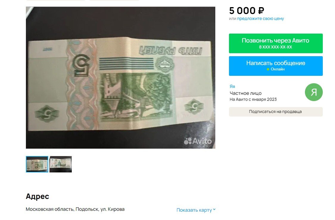 Привет, друзья. Я, конечно, все понимаю, времена тяжелые, всем нужны деньги, но есть индивидуумы которые хотят заработать на ВОЗДУХЕ! Вот Вам пример: Человек из Подольска на полном серьезе продает бумажные 5 рублей, которые появились недавно! И продает он их за 5000! Ниже дам ссылочку на объявление. Я не понимаю в чем суть? От того что большинство на безнале? Им тогда можно все бумажные деньги продавать)) Народ, кому надо - могу просто обменять монетки на бумажки)) благо у меня дома таких полно :) Либо совет: сходите в Пятерочку! Там реально сдачу могут дать 100 рублей одними такими бумажками. Ссылка на объявление https://www.avito.ru/podolsk/kollektsionirovanie/5_rub_bumazhnye_3507476114