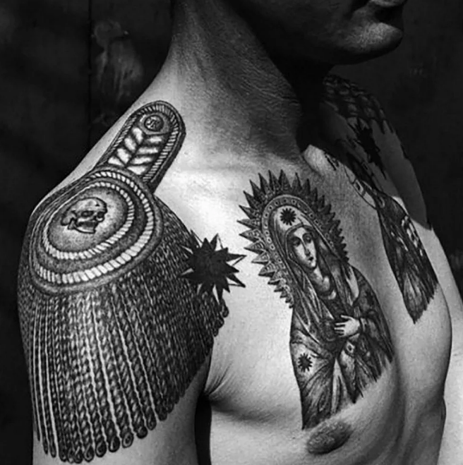 Эполетные татуировки в частности могут быть как у приверженцев уголовного мира, так и у военных. В данном случае рассмотрим приверженность к военнослужащим и силовикам (в дополнение к основной теме).