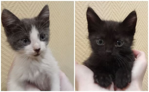 Маленьких котят (1- 1,5 мес.) нашли на Набережной Дрейера. Они выбегали на дорогу ближе к полуночи и запросто могли попасть под машину. Котята были худые, почти скелетики, поэтому, когда люди принесли им баночку детского питания, набросились на нее и даже рычали друг на друга. Неравнодушные люди забрали себе мелкашей. Уже днем котята перестали драться за корм, а спустя двое суток стали переваливаться колобочками. Черный – мальчик, бело-серая – девочка. Оба бедовые и готовы пободаться даже с массивным котеем, который весит 7 кг. Котята дружелюбные и ручные. Самостоятельные: сразу стали ходить в наполнитель, даже без присмотра. Сейчас самое время приучать котят к когтеточкам. Специальный столбик люди готовы отдать вместе с одним из котят. Так же вместе с хвостатыми в новый дом поедут игрушки на первое время. Еще люди обязуются помочь оплатить кастрацию и стерилизацию, когда котикам исполнится около полугода. Те, кто нашел животных, оставить малышей в доме не могут. Они приезжие, и уже со