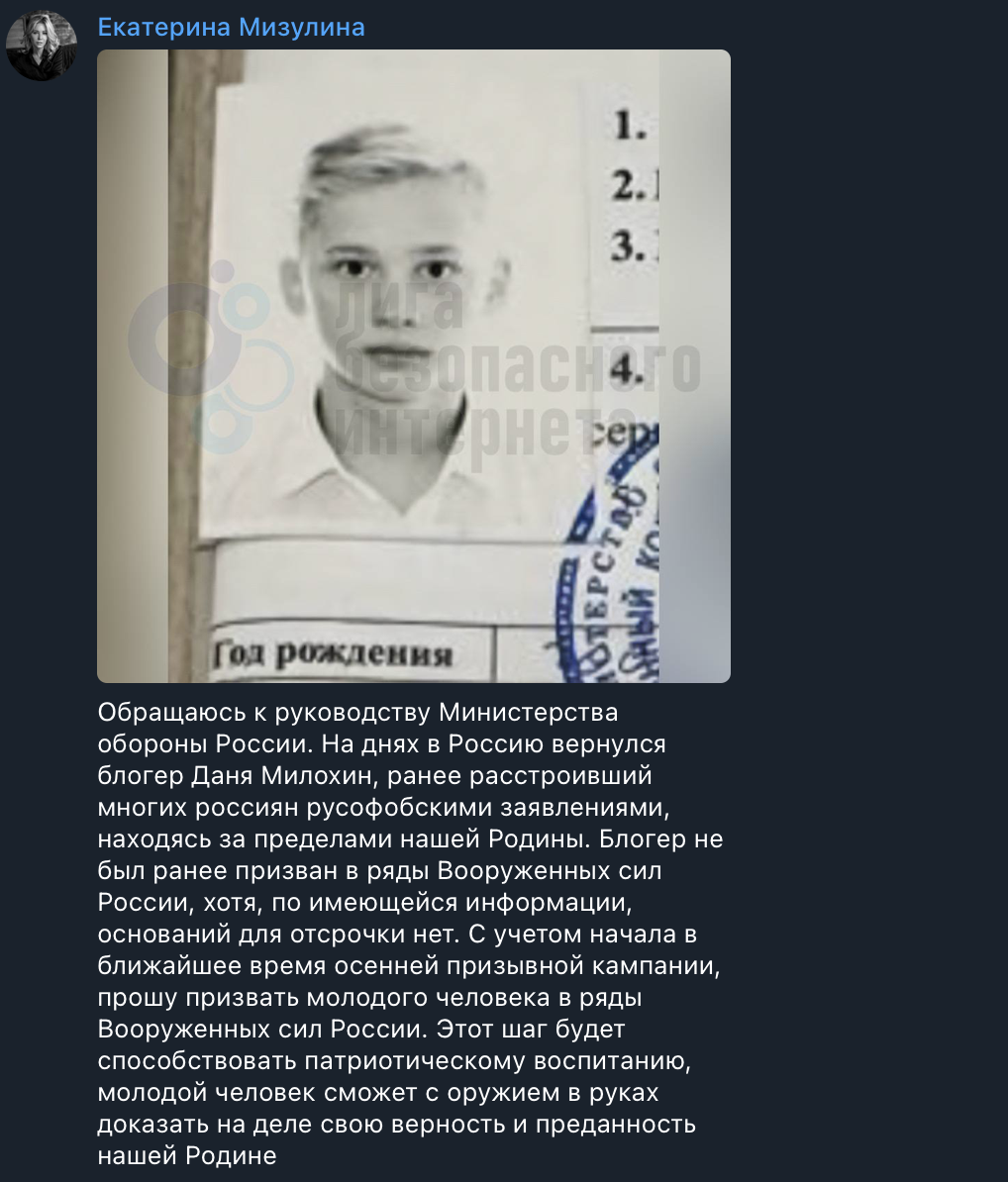 На Родине Милохин пробыл недолго. Тут его встретила глава «Лиги безопасного интернета» Екатерина Мизулина, которая публично обратилась к Министерству обороны России с просьбой призвать тиктокера в ряды российской армии. По мнению Мизулиной, парень сначала должен доказать свою преданность Родине, прежде чем снова зарабатывать миллионы на российской аудитории.