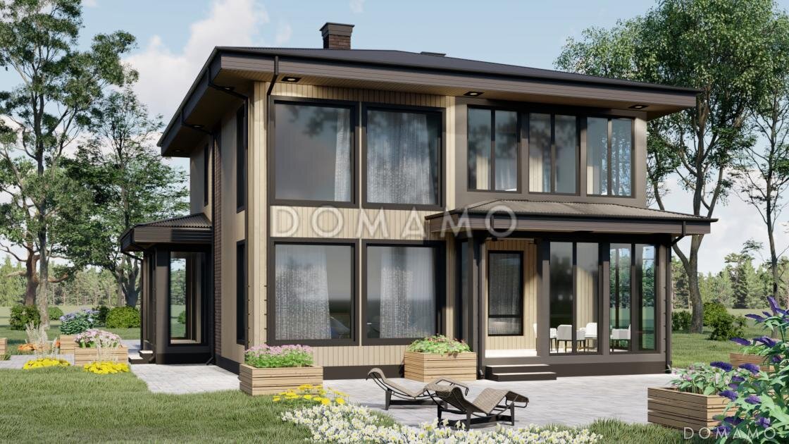 Проект каркасного дома с панорамными окнами и верандами на обоих этажах, площадь 164 кв. м