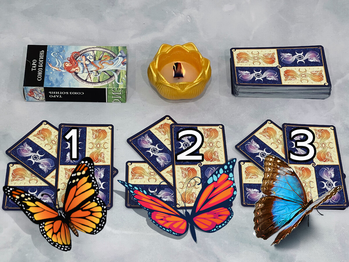 Чтобы получить ответ от карт вам нужно выбрать одну из трех стопочек, которые вы видите на фото. Для того, чтобы вам легче было воспользоваться вашей интуицией, я для каждой стопочки выбрала символом бабочку. Можете попробовать выбирать не по номеру, а по бабочке, кому как удобно. Когда выберите себе карты, читайте описание ниже.