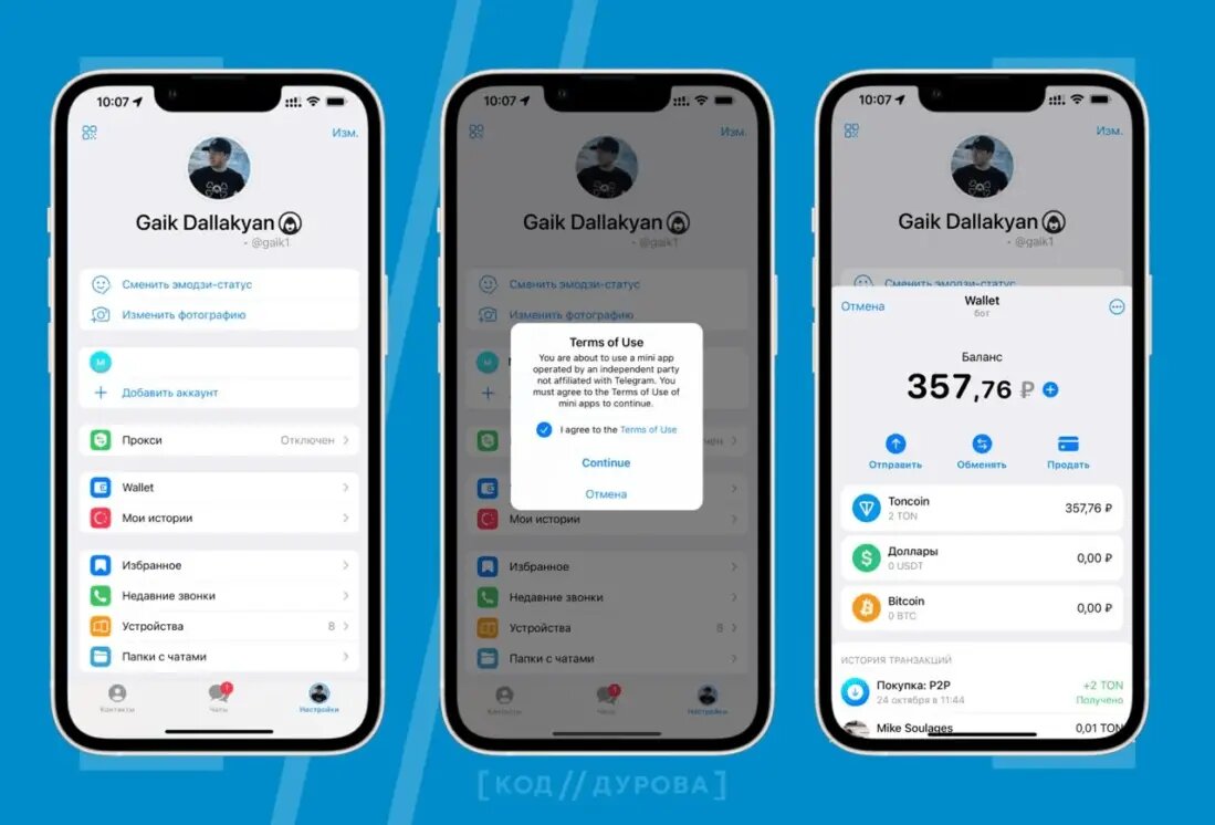 В настоящее время функция доступна только для пользователей бота с таким же именем, но начиная с ноября 2023 года она будет доступна всем пользователям. TON Foundation, разрабатывающая Wallet, объявила о сотрудничестве с Telegram, согласно информации из «Кода Дурова». Это сотрудничество позволит интегрировать криптокошелек с мессенджером, обеспечивая пользователям прямой доступ. Уже сейчас иконка Wallet доступна в настройках Telegram для пользователей бота, и они также могут использовать бета-версию кошелька TON Space, разрабатываемую командой Wallet. С начала ноября 2023 года эта функция станет доступной для всех пользователей Telegram, за исключением США и некоторых других стран. Кроме того, Telegram предоставит партнёрам TON приоритетный доступ к своей рекламной платформе, но конкретные детали остаются неизвестными. Планом является охватить около 30% пользователей мессенджера до 2028 года. Wallet, который ранее функционировал как Telegram-бот с января 2022 года, продолжает расшир