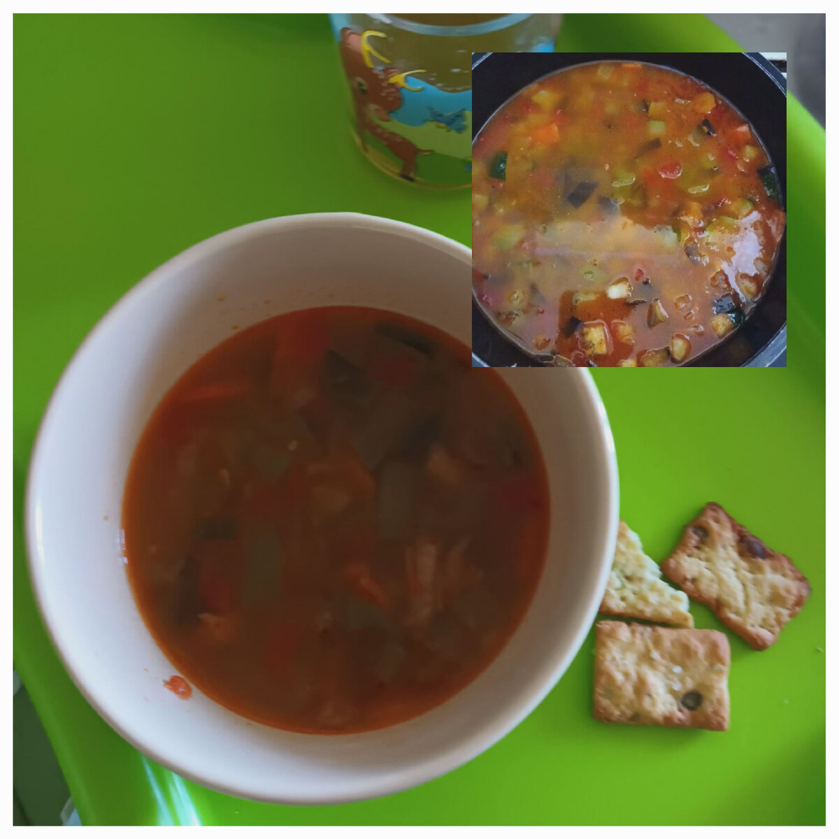 Сегодня предлагаю вам очень вкусный густой супчик. Ингредиенты: Индейка - любая часть 300 грамм; Кабачок - 1/2 штуки; Баклажан - 1/2 штуки; Морковь - 1 штука; Лук - 1 штука; Болгарский перец - 1 штука; Помидор - 3 штуки небольших; Чеснок - 1 зубчик; Соль, перец чёрный молотый, копченая паприка, сахар, растительное и сливочное масло для жарки. Ставим вариться нашу индейку. Если у вас филе, то можно обжарить. У меня на кости. В это время нарезаем баклажан и отправляем его в подсоленной воду чтобы ушла горечь. Для себя я так не делаю, но дети не любят, когда он горчит. В это же время ставим чайник. В помидорах делаем крестообразные надрезы в районе плодоножки. Заливаем их кипятком на пару минут, а затем холодной водой. В это время нарезаем лук, чеснок и морковь. Отправляем их в сотейник с предварительно разогретым сливочным маслом. Туда же отправляем нарезанный перец и помидоры, предварительно сняв кожицу. Я сразу добавляю две чайные ложки (без горки) чтобы нейтрализовать кислоту том