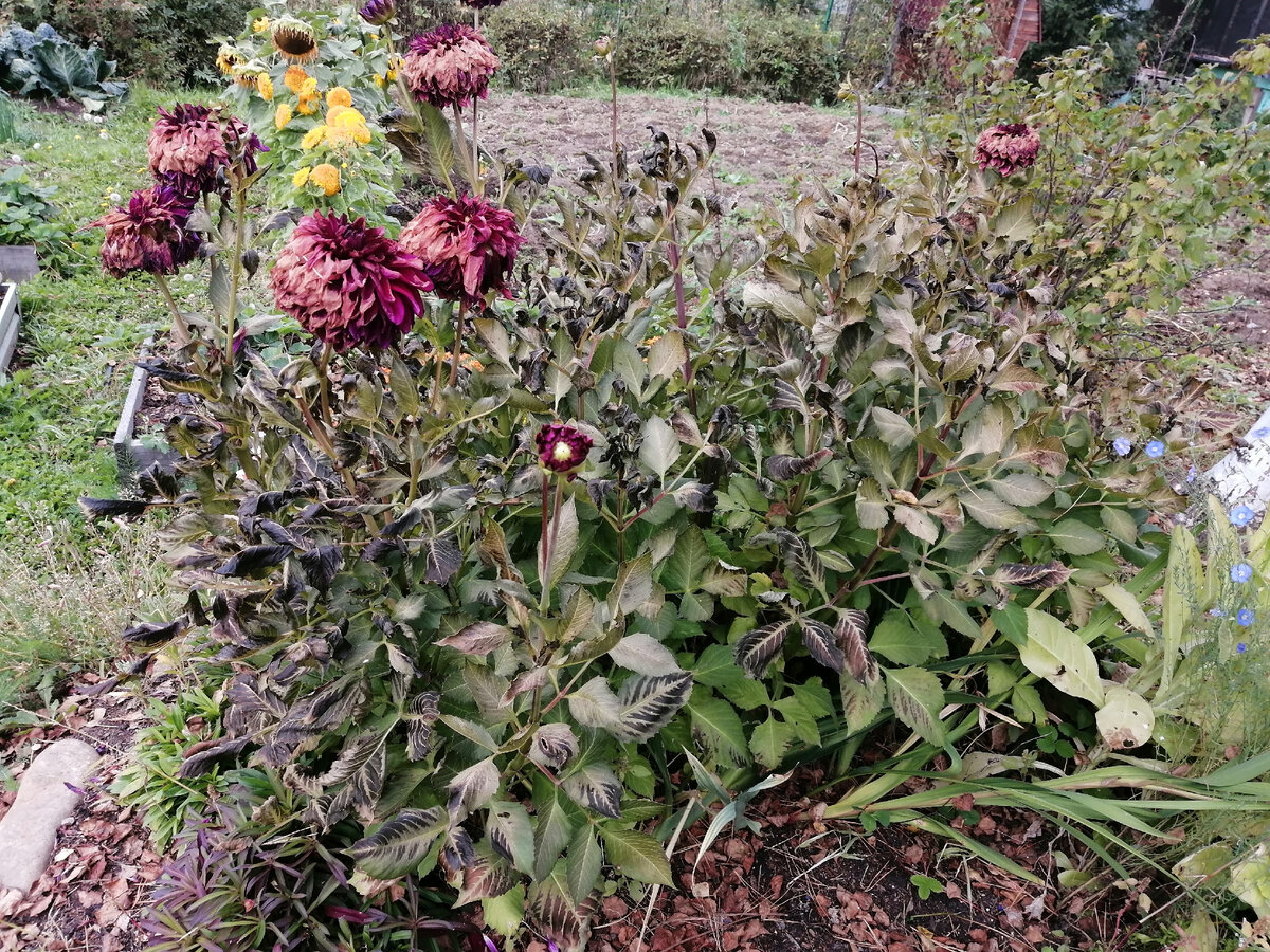 На днях у нас ударили первые заморозки, были они не очень сильные и не везде. В городе обошлось, а за городом... по крайней мере, у нас в садоводстве они были точно, все соседи обсуждали это в чате. Ну и выбралась я посмотреть как там мой участок, что живо, а что замёрзло. Приехала и сразу побежала смотреть на свои кустики и цветочки. Конечно, заморозок не пощадил георгины, они ведь очень нежные, сами цветы замёрзли, а внизу кусты оказались целые. Из этого я сделала вывод, что заморозок был не очень сильный, наверное, где-то около -1. Хорошо, что в прошлый раз я букет срезала домой, хоть дома порадуют нас, постоят немного Бархатцы тоже не сильно подморозились, даже цветут ещё Сильнее всего пострадали кустики внизу участка, около капусты, там самое холодное место у меня А кустики тонколистных бархатцев стоят отлично, видимо их георгины закрыли от холодного воздуха Лаватера даже не заметила, по-моему, ночного понижения температуры, ну этого и следовало ожидать, она может выдержать д