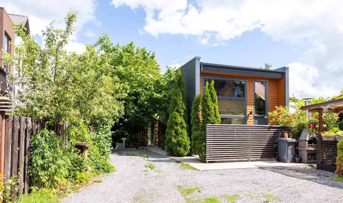 Частные дома кубической формы смотрятся на фоне традиционных коттеджей с двускатной крышей очень современно. Такие постройки с плоской крышей — воплощение нового взгляда на архитектуру: практичные и стильные, без вычурного декора Этот дом, построенный в форме куба, находится в Пярну — портовом городке на юго-западе Эстонии. Владельцы проводят в нём свой отпуск, а в остальное время сдают дом путешественникам, поэтому внутри есть всё, что необходимо для отдыха и комфортной жизни. Коттедж выглядит очень компактно и имеет плоскую крышу с небольшим уклоном для стока дождевой воды. Боковые фасады обшиты металлическими листами глубокого серо-синего цвета, в тон которому подобран и оттенок оконных рам. Дорожки вокруг дома бетонные, остальное пространство участка засыпано гравием — ухода здесь требуют только высокие туи, служащие своеобразными воротами в маленький внутренний дворик при парадном входе, а также небольшая лужайка, пара деревьев и кустарников на заднем дворе. Около домом обустроен