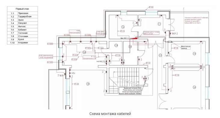 Полноценный проект Умного дома, или каких-то других инженерных систем делается сравнительно долго. А это потеря времени за которое заказчик может найти других исполнителей. Поэтому для того, что-бы зайти на объект и начать работать выполняется мини-проект (он же драфт-проект), который делается быстрее. Что он в себя включает? Для начала вспомним из чего состоит полноценный проект. Берется план помещений на котором обозначаются элементы системы, линии кабельных трасс, условные обозначения, а также рекомендации по монтажу. Вот один из примеров такой схемы. В который входит список всех кабельных линий, их тип, маркировка, длина, назначение. Или щитов если их несколько. На этой схеме указано наполнение щита или слаботочного шкафа. Это различные датчики, приводы, кнопки управления. В этой схеме показана их взаимосвязь между собой. Представляет из себя таблицу, в которой указано к какому входу и выходу контроллера что подключается. А также маркировка контактов контроллера. Также выполнено в