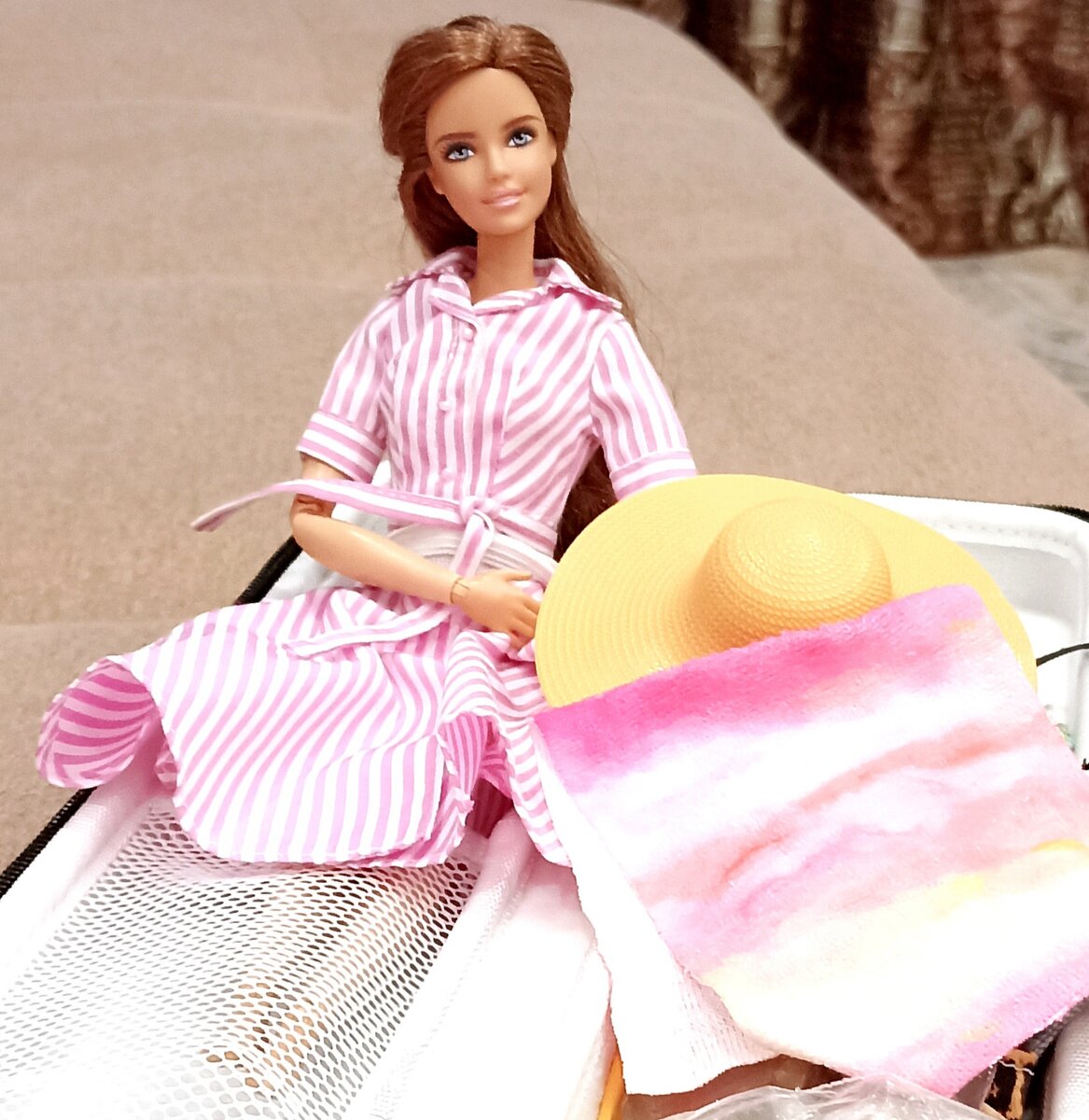 Как лучше всего развеять тоску? Правильно - отправиться в отпуск! Поэтому собираем чемоданы, пакуем куклу и едем отдыхать. Куда? В Сочи! Еще и не просто отдыхать, а лечиться в санатории. Вы не поверите, но я ни разу в жизни не была на море. И вот наконец-то смогла окунуться и поплавать в морюшке. Это, скажу я вам, настоящий кайф. Оно такое теплое, ласковое и соленое. Наплавалась я вволю. До сих пор очень приятные воспоминания об отдыхе )) Долго думала кого же взять с собой в дорогу, все таки без куклы уже как то непривычно ехать. Решила, что со мной в путешествие отправится одна из моих новеньких красоток. Спасибо девочкам за подсказку - на нескольких каналах видела, что перевозят кукол в чехле из под утюжка/плойки для волос. Приобрела его на вб и просто в восторге от данного чехла. Очень удобно перевозить в нем куклу, помимо которой, туда довольно приличное количество нарядов и аксессуаров влезает. Так что все нужное у нас было с собой) Вот так аккуратно он выглядит снаружи. Отдых пр
