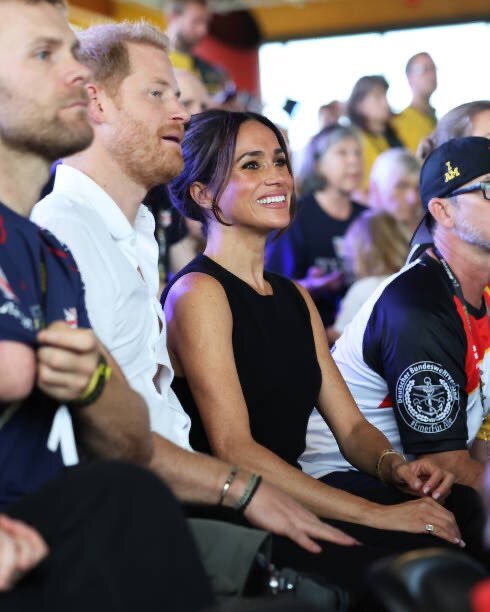 Меган Маркл и принц Гарри продолжают "отрабатывать программу" на Играх Непокорённых. Идёт четвёртый день соревнований. На этом фото она с талисманом Игр - немецкой собаке Ховаварт. Кроссовки на ней - Hermès GET стоимостью 620 фунтов стерлингов, выполненные из парусины и телячьей кожи. Сассекские с утра посмотрели баскетбол на колясках, а вечером пришли на финал соревнований по плаванию. Вот так приехали и пришли, на электрокаре: Меган Маркл появилась в интересном наряде: облегающих чёрных штанах и чёрной блузке без рукавов. Они также продолжают активно общаться с болельщиками, организаторами и спортсменами. А вот это фото - огонь! Интересно, что они увидели? Чуть позже Меган умудрилась переобуться и накинуть пиджак Всегда с удовольствием фотографируются.