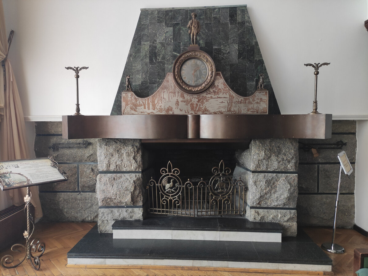 Об уникальных каминах "Замка на Волге" я была наслышана. Последний день в санатории был посвящён знакомству с шедеврами русской каминной архитектуры. Третий этаж. Охотничий зал - самый масштабный и уютный. Здесь проводятся литературно-музыкальные вечера. Только этот камин зажигают. Впечатляюще! Переднее панно изготовлено из листовой меди и отражает сюжеты рыбалки и охоты. Оклад, часы, фигурки охотника, собак, глухаря и кабана выполнены из бронзы. Корпус камина выложен из карельского камня габбро диабаз. Зал наполнен чучелами диких животных. Два медведя, лиса, волк, рысь, птицы привлекают и детей, и взрослых. Это наиболее популярная фотозона. Третий этаж. Камин "Волга и притоки". Мраморный блок изготовлен из уральского мрамора, добытого в селе Коелга Челябинской области. В облицовке подиума использован камень лабродарит. Решётка из латунного прута. Во время экскурсии в музее санатория экскурсовод рассказала занятную историю. Когда стали строить камин, потеряли мраморный блок. Сколько