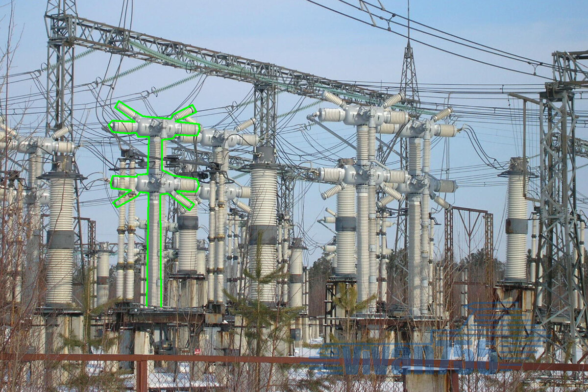 500 — рабочее напряжение в киловольтах (да-да, полмиллиона вольт), а буква К означает, что выключатель работает на сжатом воздухе с давлением 4 МПа или 40 атмосфер. Именно столько нужно, чтобы сдуть с контактов и погасить дугу — по сути молнию, плазменный шнур. Горизонтальные «рога» — дугогасительные камеры, наклонные — делительные конденсаторы, они поровну делят напряжение между камерами выключателя.