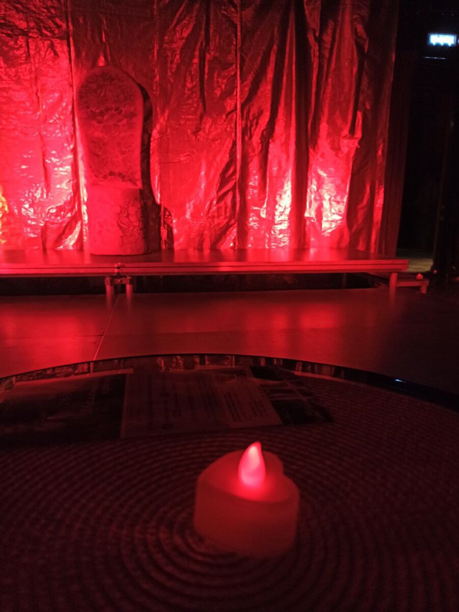 В частном калининградском театре Николая Захарова "Содружество актёров" удалось посмотреть "Мастер и Маргарита. Бал". Спектакли этого театра проходят в небольшом помещении на цокольном этаже: вытянутый прямоугольный зал, по длинной стороне которого обычно сцена, а по трём сторонам в один ряд расположены столики и стулья для зрителей. Столики всегда с угощением - бокалом шампанского. Для "Мастера и Маргариты" единое пространство разбили плотными тёмными занавесами на три и дополнительно подключили к игровому пространству зону гримерок. Шампанское убрали (его подачу обыграют позже). Свет на время первой части заменили пламенем свечей - атмосферно, классно, немного загадочно. Зрителей рандомно распределили по четырём группам, за каждой закрепили сопровождающего и - в путь! Идея использовать имеющееся пространство таким образом мне очень понравилась. На каждой из четырёх локаций одновременно идут сцены из романа. Слышимость хорошая и потому симультанность действия сочетается с интригой -