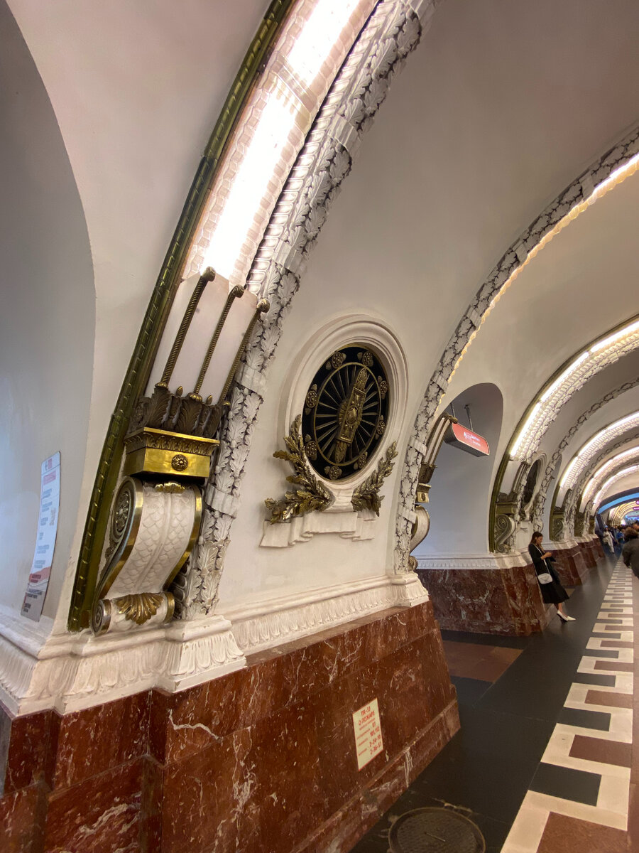 Эту прогулку я начну для вас прямо из вестибюля станции метро Площадь Восстания. Станция находится на глубине 58 метров под землей. Выполнена по проекту архитекторов В. В. Ганкевич, Б. Н. Журавлёв, И. И. Фомин. Классическая станция в стиле сталинский ампир, тема оформления революция 1917 года. Центральный зал украшают белые лепные арки со встроенными в них световыми дугами. Отделка отличается богатством лепнины.Здесь можно увидеть барельефные медальоны, которые представляют большую художественную ценность. Платформы украшают большие люстры, на которых изображены серп, молот и пятиконечные звёзды.