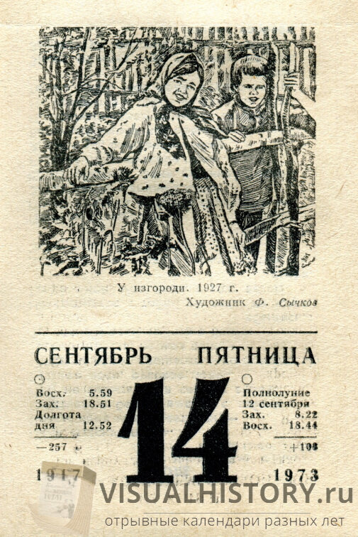 В этой ежедневной рубрике мы с вами листаем листки советского отрывного календаря. Больше листков отрывных календарей смотрите у нас на сайте - visualhistory.ru Каждый день мы с вами смотрим очередной листок на сегодняшний день, но отстоящий от нас ровно на пятьдесят лет. Итак, сегодня на нашем отрывном календаре - 14-е сентября 1973-го года *** У изгороди. 1927 г.