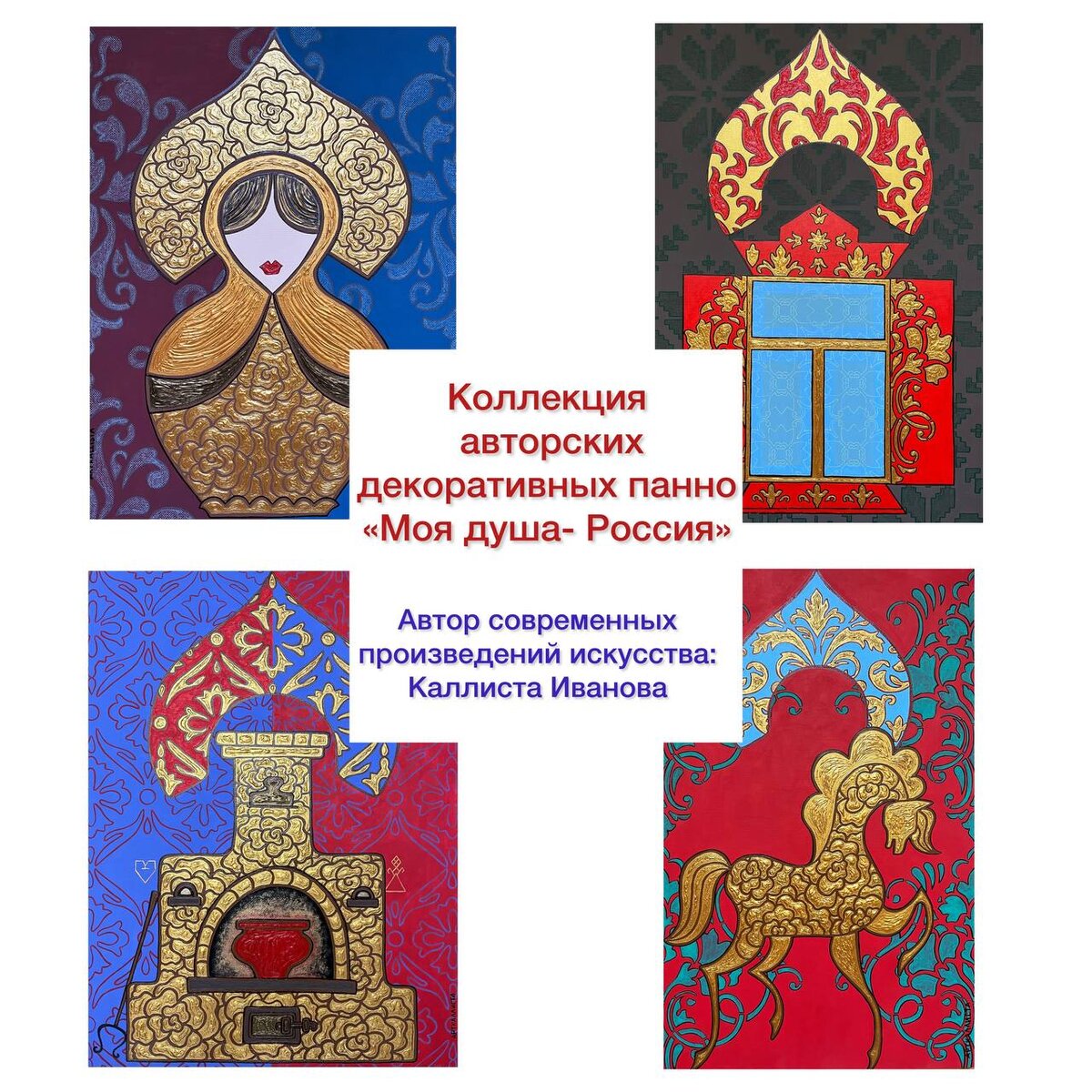 Для выставочного проекта «Моя душа – Россия», художница подготовила произведения, основанные на русской традиционной культуре. Каждое панно – символ русской души, отражение той или иной культурной парадигмы или национальной ценности.