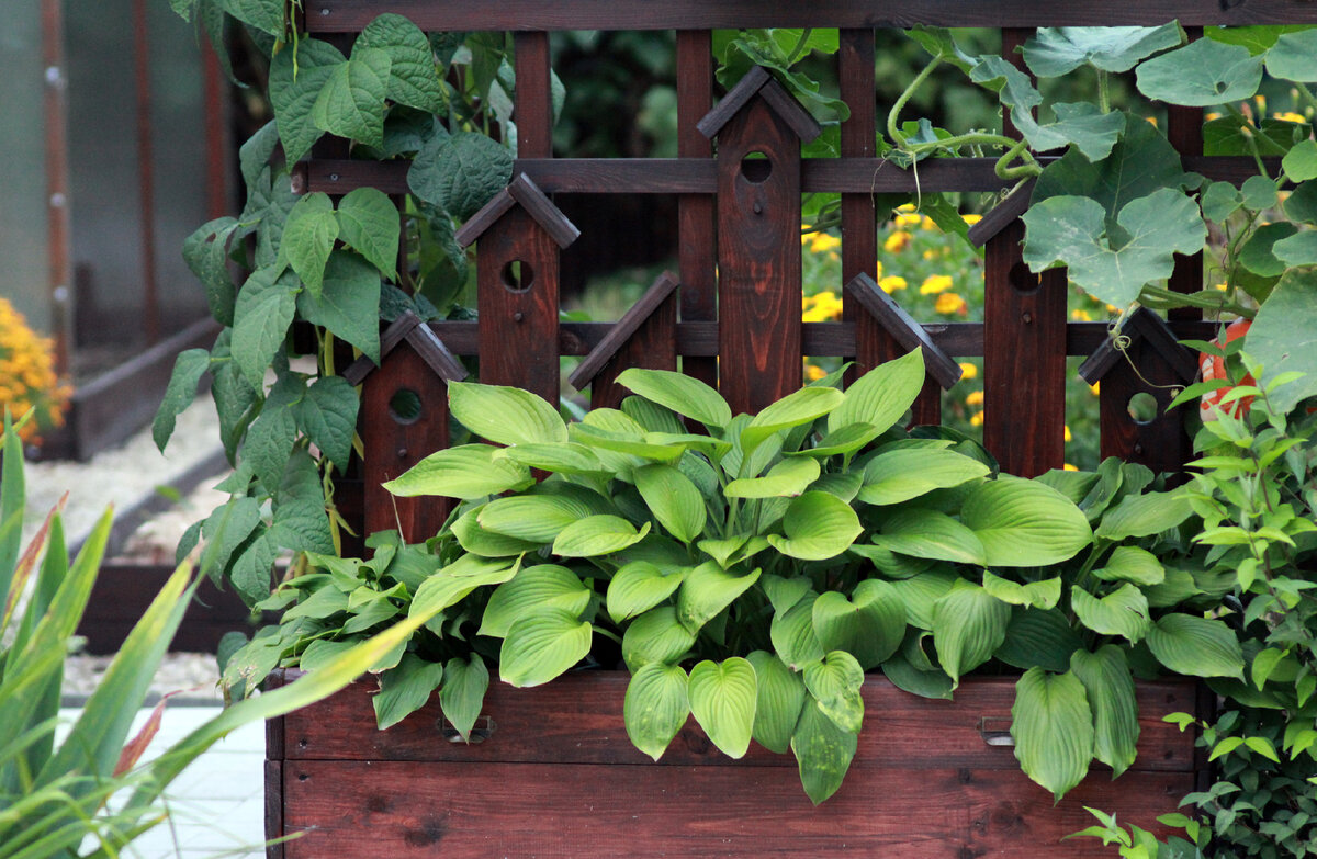 Новую зону отдыха я украсила домиками из дерева. Меня спрашивали, как я их сделала. Хочу сегодня рассказать подробнее. Идея создания этого декора была случайной. Просто я напилила и покрыла пропиткой две лишние доски. А начале лета я делала ящик для хост с декоративными скворечниками. Из оставшихся досок я решила сделать декор, гармонирующий с элементами этого ящика. Но повторяться не хотелось. Поэтому я сделала не скворечники, а домики. Одну доску оставила как есть, вторую распилила на две равные части. В остатках нашла еще два отрезка доски и также покрыла их пропиткой. Итого у меня получилось пять домиков. Верх досок я срезала по косой и в виде треугольников. Из бруска сделала крыши. У самого высокого домика сделала две крыши и домик стал двухэтажным. Из тонкого старого железа вырезала окна и двери. Прибила их маленькими гвоздиками, предварительно просверлив отверстия. Таким же железом обила крыши. Готовые домики прикрутила к деревянной стене на саморезы.