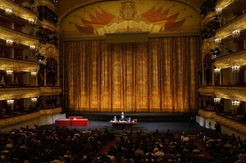 В театре прошел традиционный сбор труппы. Как мне показалось, народу сегодня было меньше чем обычно. У многих артистов (оперы, балета, миманса) репетиции. Технические службы тоже работают. Кстати, и журналистов было меньше. Или мне только это показалось. Как обычно, в начале был показан фильм, рассказывающий о прошлом сезоне. Видео в конце статьи. Потом Владимир Георгиевич подвел итоги прошлого сезона, поделился цифрами - сколько спектаклей (оперных и балетных ) было в прошлом году. Страшная цифра. Почти 700 спектакле. Если выкинуть все выходные и отпуск, то получается по два, а то и три спектакля в день. Потом В.Урин расказал о планах на следующий год. И в первую очередь о планах оперы. В театре ведь до сих пор нет музыкального руководителя и главного дирижера, который обычно знакомит с планами оперного коллектива. У оперы намечается неколько премьер. Первой премьерой сезона на станет опера Фраческо Чилеа "Адриана Лекуврер" - 16 ноября на Исторической сцене. 30 ноября 2023 на Кам