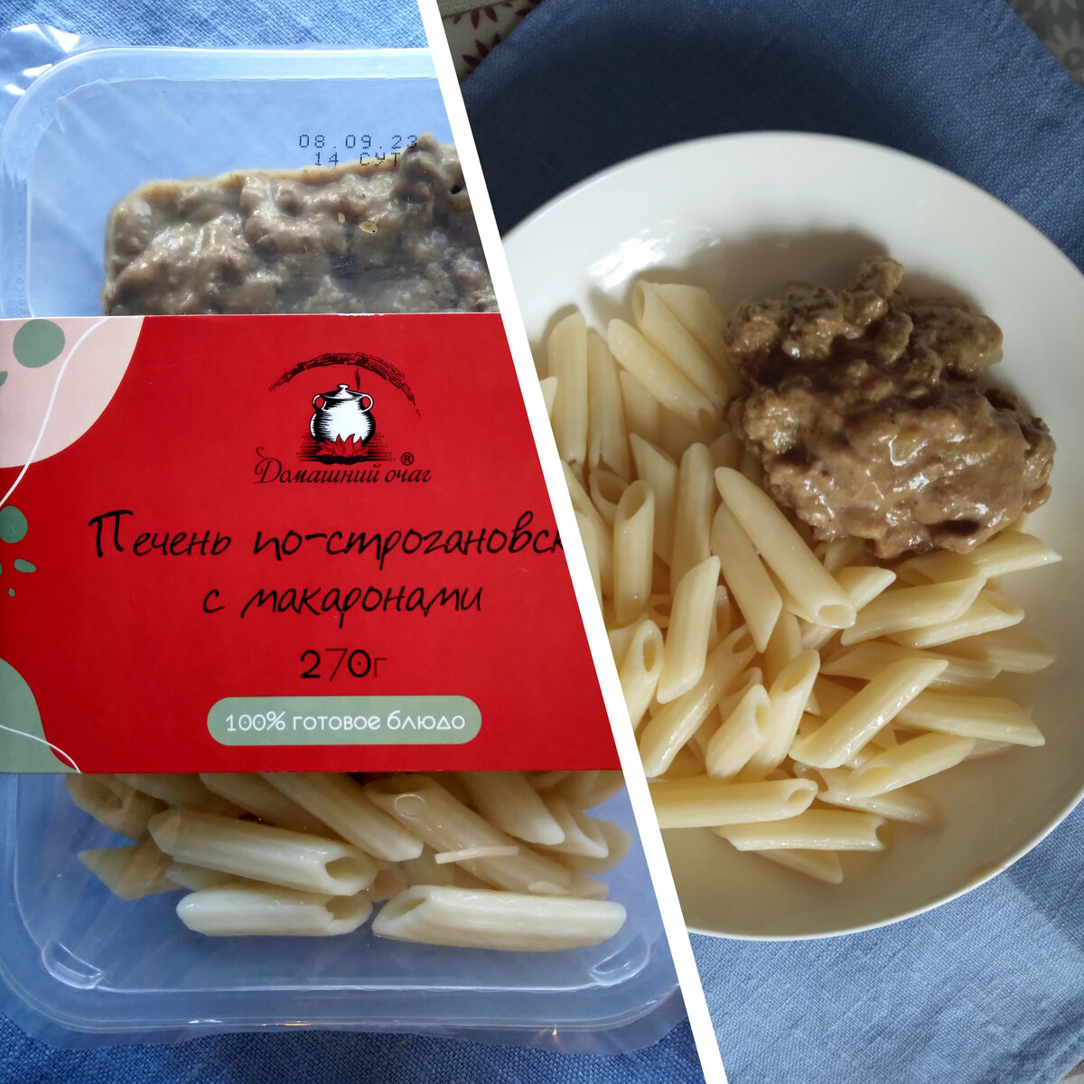 Как выбрать готовый обед, если у вас нет времени готовить, а бюджет невелик? У «Домашнего очага» от питерского производителя «Великоросс» несколько вариантов готовых блюд в пластиковой упаковке. Я остановилась на блюде печень по-строгановски с макаронами. Выглядит упаковка очень прилично, а цена невелика. Получилось ли у производителя совместить экономию с качеством? Из чего сделано это блюдо В составе, согласно, этикетке, только натуральные продукты: макароны, печень говяжья, вода, масло подсолнечное рафинированное, лук, молоко сухое, соль, мука, специи. Вес блюда 270 грамм. Калорийность 160 Ккал на 100 грамм, значит калорийность всего блюда 432 Ккал. Открываю упаковку На вид упаковка чистая, хорошо запечатанная. Согласно этикетке, использовался упаковочный газ. При открывании пленки чувствуется запах свежей еды без каких-то посторонних примесей. Аромат печени по-строгановски вполне как у домашнего блюда. Разогреваю и пробую Немного погрела в пластиковом лоточке, затем переложила в