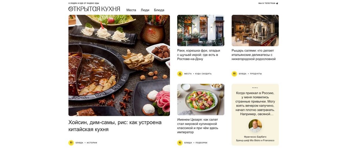 Яндекс славится своими бренд-медиа – чего стоят только 'Дока', 'Код', 'Кинжал'. В мае 2023 появились новости про 'Открытую Кухню' – медиа про шефов и еду, которое аккуратно просовывает упоминание 'Яндекс Еды'. Наконец сайт запустился в полную силу – можем смотреть. - - - - - Удачно пронесли стиль Яндекс Еды сквозь диз – от цвета, до шрифта и иконок. Нравится, что заголовки в одном стиле написаны – как бы с микроподводкой-хуком. Это клево, но иногда от этого можно заскучать. Еще нравятся приятные поды-карточки с историями. Они понятные и трендовые, хоть и слегка избитые. Сам подход к сайту хороший. Это тебе не какая-то Тильда или Викс. Тут взрослый Реакт на компонентах. В дизе мне не хватило только его излишняя стерильность. Он даже суховат слегка, вот. Думаю им ндо подумать что-то с фоном. Диз 6/10. 'Открытая Кухня' Лапчик Царапчик