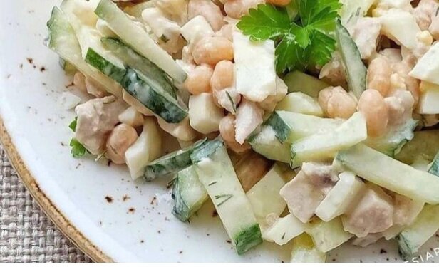 Салат- бомба. Сделайте и вкусный ужин вам гарантирован. Что надо? 2 варёный яйца, огурец, одно варёное филе курочки, белая консервированная фасоль. Заправка (соус) будет ПП ( это модно сейчас): сметана, соль, зелень, чеснок (можно сухой, а можно пропустить через пресс) Все ингредиенты нарезаем (я люблю нарезать брусочками) и заправляем нашим соусом. Приятного аппетита)))