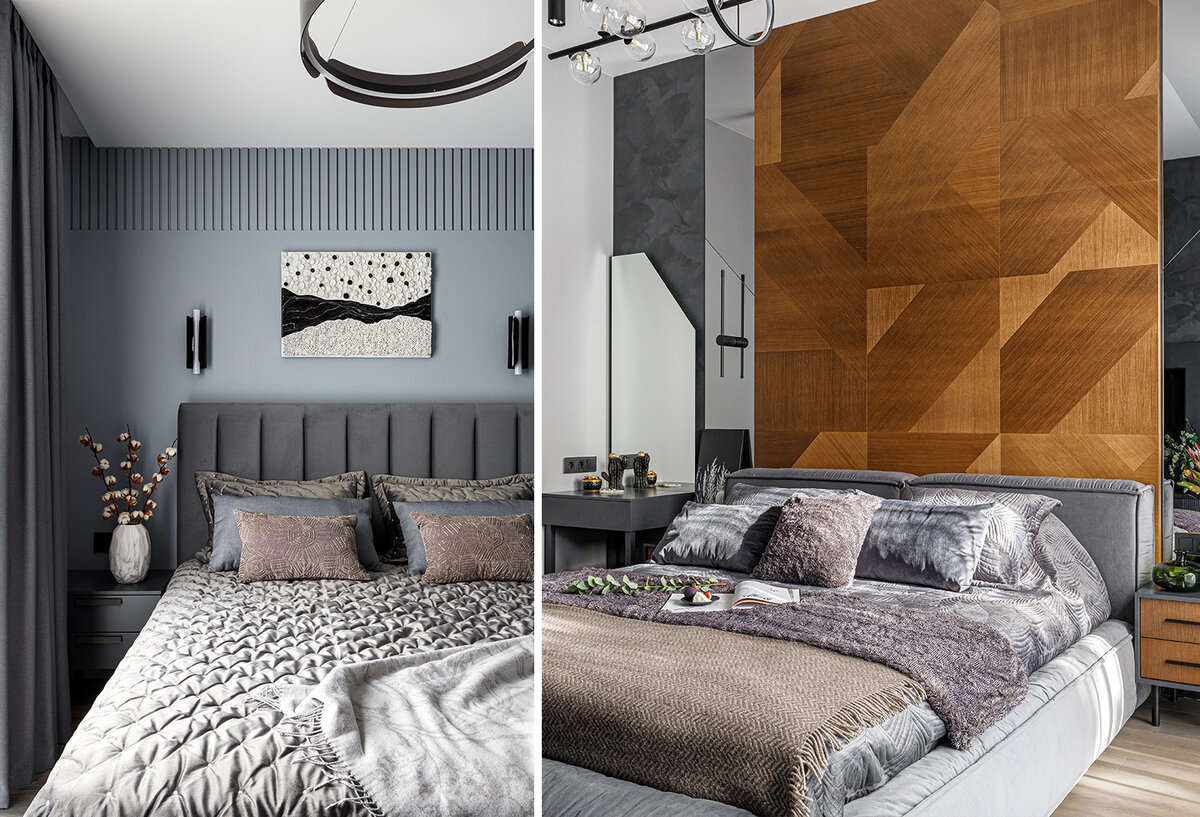 В мастер-спальне темная серо-графитовая палитра стен разбавлена теплом натурального шпона. Тонированные зеркала задают сложную геометрию и многогранность пространству.